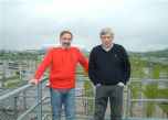 Dois bons amigos no topo do edifício da BMW com o estádio Allianz Arena em fundo